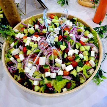 This dish is filled with Delish ingredients, including; Crisp Romaine Lettuce, Grape Tomatoes, Kalamata Olives, Cucumbers, Red Onions, Feta Cheese. Served with Greek Dressing on the Side.